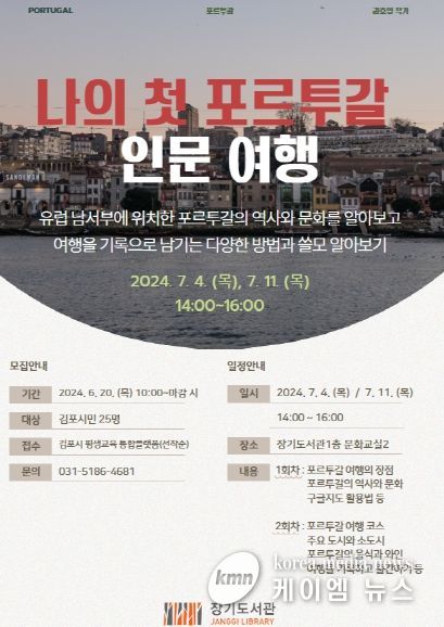 (케이엠뉴스) 김포시 장기도서관이 인문학 강의 ‘나의 첫 포르투갈 인문 여행’을 7월 4일과 7월 11일 오후 2시부터 4시까지 운영한다. 포르투갈 여행을 계획하고 있지 않아도 포르투갈의 역사와 문화를 이해하고자 하는 김포시민이라면 누구나 수강 가능하다.
