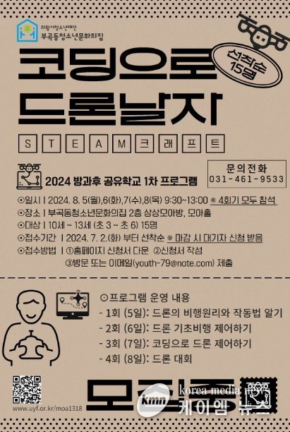 (케이엠뉴스) 의왕시청소년재단 부곡동청소년문화의집에서 2024 방과후 공유학교 STEAM크래프트 1차프로그램 ‘코딩으로 드론날자’참가자를 모집한다.