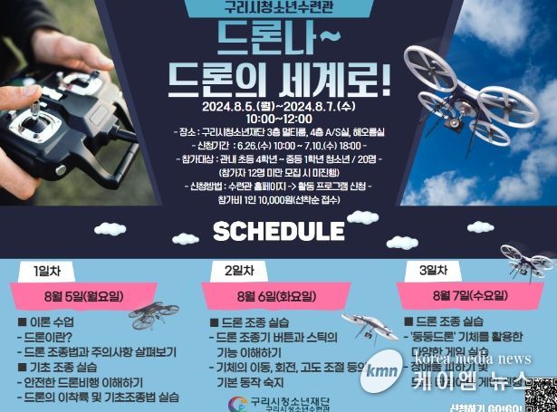 (케이엠뉴스) 구리시청소년재단 청소년수련관은 오는 8월 5일부터 8월 7일까지 2박 3일간 ‘드론나~ 드론의 세계로!’ 문화 창작 교실을 운영한다.