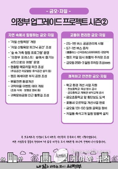 (케이엠뉴스) 의정부시는 시민들의 삶의 환경을 한 단계 개선하기 위한 ‘의정부 업그레이드 프로젝트’의 시즌2 금오‧자일편을 27일 발표했다.