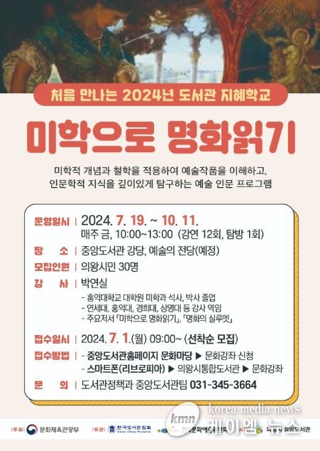 의왕시 중앙도서관은 예술 프로그램 개설에 대한 지역 수요를 반영해 ‘미학으로 명화읽기’를 주제로 7월 19일부터 10월 11일까지 13주간 매주 금요일에 도서관 지혜학교를 운영한다.