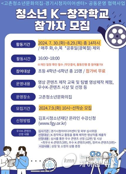 (케이엠뉴스) (재)김포시청소년재단 고촌청소년문화의집에서 경기시청자미디어센터에서 진행되는 청소년 K-창작학교 공동운영(협력사업)이 7월~11월까지 운영된다.