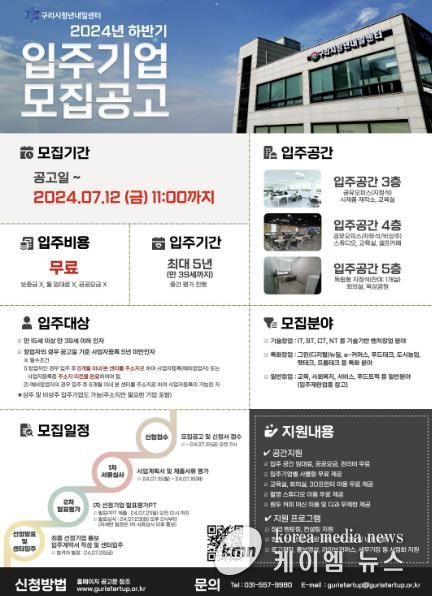 (케이엠뉴스) 구리시는 오는 7월 12일까지 청년내일센터에서 2024년 하반기 입주기업을 모집한다고 밝혔다.