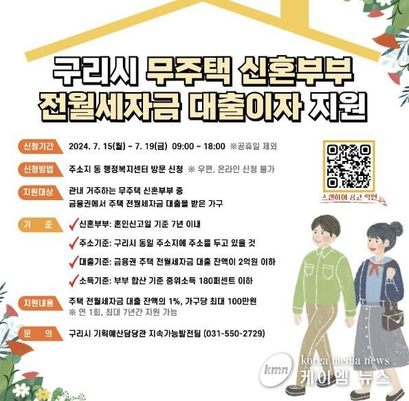 (케이엠뉴스) 구리시는 관내 무주택 신혼부부를 대상으로 ‘2024년 제2차 무주택 신혼부부 전월세자금 대출이자 지원사업’을 실시한다고 8일 밝혔다.