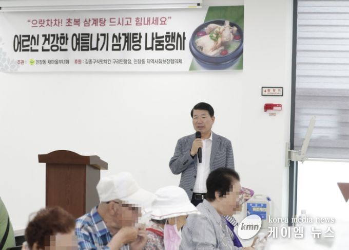 (케이엠뉴스) 구리시 인창동 행정복지센터는 7월 9일 인창동 새마을부녀회 주관으로 관내 홀몸 어르신들을 초대해 삼계탕과 다과를 대접하는 ‘어르신 건강한 여름나기 삼계탕 나눔 행사’를 개최했다.