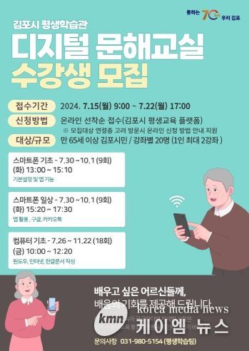(케이엠뉴스) 김포시는 교육부 공모 ‘2024년 성인문해교육 지원사업’에 선정됨에 따라 디지털 기기 사용에 어려움을 겪을 어르신들을 위한 디지털 문해교실을 운영한다고 밝혔다.