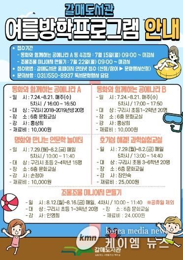 (케이엠뉴스) 구리시 갈매도서관은 여름방학을 맞이한 어린이들이 유쾌하고 뜻깊은 시간을 보낼 수 있도록 오는 7월 24일부터 8월 21일까지 다채로운 여름방학 프로그램을 운영한다.