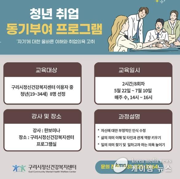 (케이엠뉴스) 구리시정신건강복지센터는 정신건강복지센터를 이용하는 청년들을 대상으로 5월 22일부터 7월 10일까지 매주 수요일에 ‘청년 취업 동기부여’ 프로그램을 운영했다.