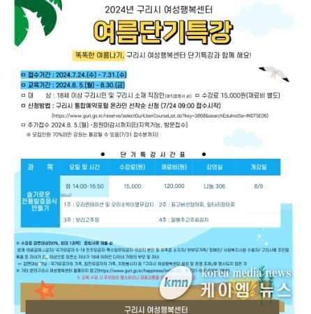 (케이엠뉴스) 구리시 여성행복센터는 오는 7월 24일부터 7월 31일까지 구리시 통합예약포털을 통해 ‘2024년 여성행복센터 단기특강 교육프로그램’ 수강생을 선착순 모집한다.