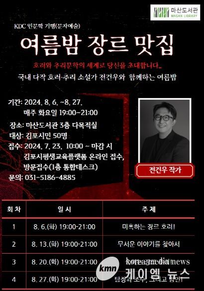(케이엠뉴스) 김포시 마산도서관은 무더운 여름을 맞이하여 오는 8월 6일부터 8월 27일 매주 화요일 19시부터 21시까지 마산도서관 3층 다목적실에서 마산도서관 ‘여름밤 장르 맛집’을 4회에 걸쳐 운영한다.