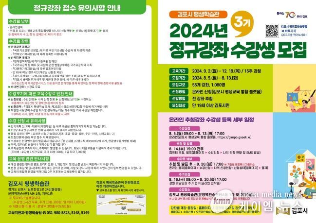 (케이엠뉴스) 김포시 평생학습관은 ‘24년 제3기 정규강좌 수강생을 8월 5일부터 8월 13일까지 모집한다.