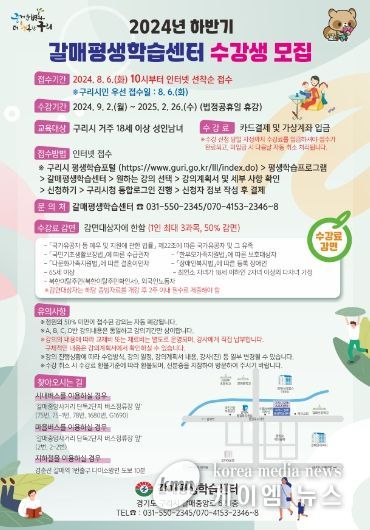 (케이엠뉴스) 구리시는 접수는 8월 6일부터 2024년 하반기 갈매평생학습센터 과정 수강생을 선착순으로 모집한다.