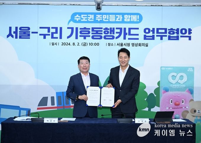 (케이엠뉴스) 백경현 구리시장은 8월 2일 서울시청에서 오세훈 서울특별시장과 만나 ‘구리시-서울시 기후동행카드 참여 업무협약’을 체결했다.