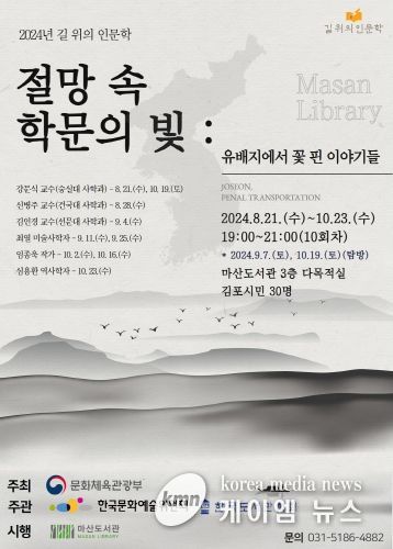 (케이엠뉴스) 김포시 마산도서관은 8월 21일 마산도서관 ‘길 위의 인문학’ 프로그램인 ‘절망 속 학문의 빛 : 유배지에서 꽃 핀 이야기들’을 2개월간 10회 차시(2회 탐방 포함)로 운영한다고 밝혔다.