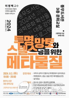 (케이엠뉴스) 김포시 풍무도서관에서 다가오는 9월 3일 화요일 19시에 과학 대중 강연 ‘투명망토와 스텔스 등을 위한 메타물질’을 운영한다.