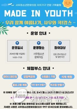 (케이엠뉴스) (재)김포시청소년재단 사우청소년문화의집에서는 2024년 여름방학 및 휴가철을 맞이하여 ‘Made In Youth '우리 함께 여름나기 사우 콕!캉스'’를 운영한다.