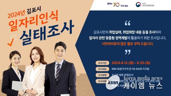 (케이엠뉴스) 김포시는 오는 8월 12일부터 8월 25일까지 관내 거주하는 표본 990가구의 만19세 ~ 64세 가구원을 대상으로 ‘2024년 김포시 일자리인식실태조사’를 실시한다.