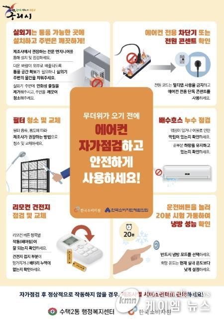 (케이엠뉴스) 구리시 수택2동 행정복지센터는 최근 연일 무더위가 지속됨에 따라 냉방기 과열이나 사용 부주의로 인한 화재 등 안전사고를 예방하기 위해 ‘에어컨 안전 점검 안내문’을 관내 주민들에게 배부했다.
