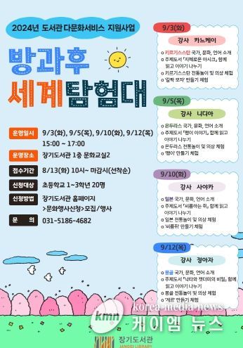 (케이엠뉴스) 김포시 장기도서관은 오는 9월 3일부터 9월 12일까지 매주 화·목요일 오후 3시부터 5시까지 초등학생을 대상으로 ‘방과후 세계탐험대’를 운영한다.
