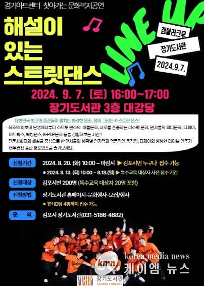 (케이엠뉴스) 김포시 장기도서관은 경기아트센터 찾아가는 문화복지공연 문화피크닉에 선정됨에 따라 댄스공연 ‘해설이 있는 스트릿댄스’를 9월 7일 오후 4시부터 5시까지 대강당에서 운영한다.