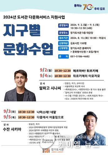 (케이엠뉴스) 김포시 장기도서관은 오는 9월 2일부터 9월 5일까지 매일 오전 10시 30분부터 12시 30분까지 김포시민을 대상으로 ‘지구별 문화수업’을 운영한다.
