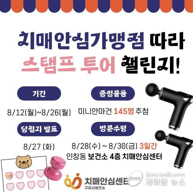 (케이엠뉴스) 구리시는 8월 12일부터 8월 26일까지 2주간, 치매친화적 환경을 조성한 치매안심가맹점을 알리기 위해 지역주민을 대상으로 ‘치매안심가맹점 따라 스탬프 투어 챌린지’를 운영한다.