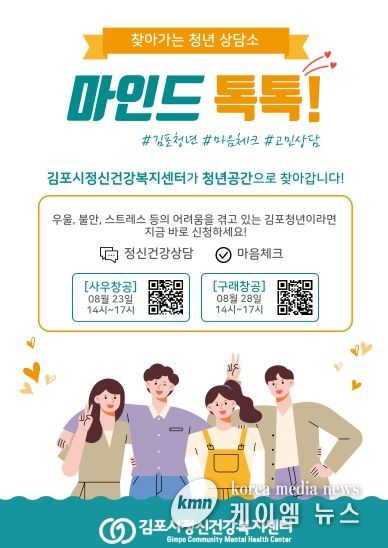 (케이엠뉴스) 김포시정신건강복지센터는 김포시 청년의 마음건강증진을 위해 올해 8월부터 찾아가는 청년상담소 ‘마인드 톡톡’을 운영한다.