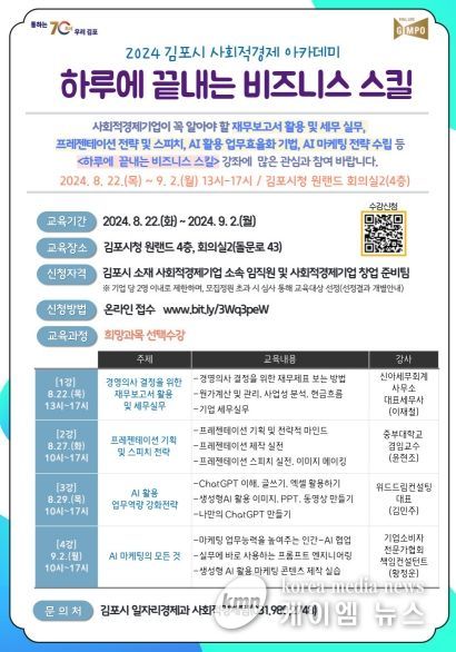(케이엠뉴스) 김포시는 사회적경제기업의 경영역량 강화 지원을 위해 ‘2024년 김포시 사회적경제 아카데미-하루에 끝내는 비즈니스 스킬’ 교육을 개설하고, 8월 19일까지 수강생을 모집한다.