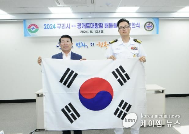 (케이엠뉴스) 구리시는 8월 12일 시장집무실에서 자매결연부대 해군1함대 광개토대왕함과 배틀플래그(Battle Flag) 교환식을 개최했다. ‘배틀플래그’란 군함이 작전 임무 수행 및 정박 중 게양하는 태극기를 뜻한다.