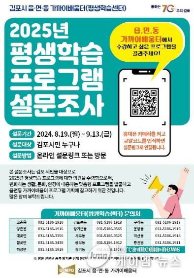 (케이엠뉴스) 김포시 읍면동 가까이배움터(평생학습센터)에서 8월 19일부터 9월 13일까지 2025년 평생학습 프로그램에 대한 수요 설문조사를 실시한다.