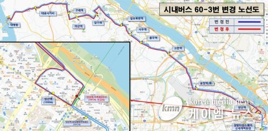 (케이엠뉴스) 김포시는 8월 16일부터 시내버스 60-3번 노선의 종점단축(경방타임스퀴어→당산역), 88번 노선의 종점단축(영등포시장→송정역) 및 김포공항역3번출구 경유 노선변경을 시행한다고 밝혔다.