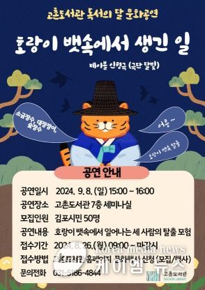 (케이엠뉴스) 김포시 고촌도서관은 오는 9월 8일 15시부터 16시까지 고촌도서관 7층 세미나실에서 독서의 달 공연 ‘호랑이 뱃속에서 생긴 일’을 운영한다.