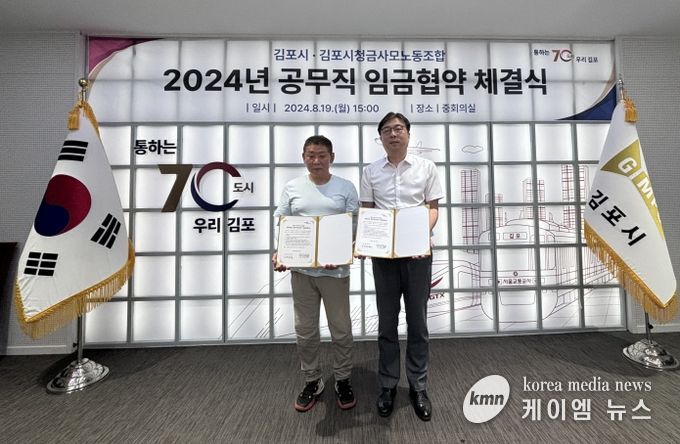 (케이엠뉴스) 김포시와 김포시청금사모노동조합이 지난 19일 2024년 임금협약을 체결했다. 주요 협약 내용은 전 직군 기본급 3% 인상이다.