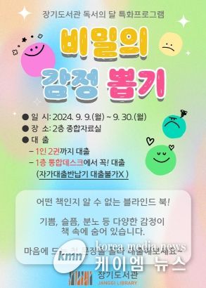 (케이엠뉴스) 김포시 장기도서관이 9월 독서의 달을 맞아 9월 9일부터 9월 30일까지 장기도서관 2층 종합자료실에서 청소년운영위원회 특화프로그램 '비밀의 감정 뽑기'를 운영한다.