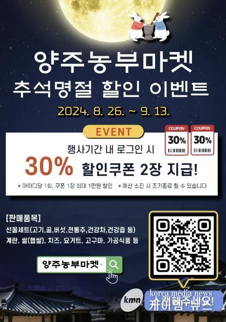 (케이엠뉴스) 양주시가 운영하는 양주시 농축산물 온라인 쇼핑몰 ‘양주농부마켓’에서 추석맞이 특별 할인 이벤트를 진행한다.