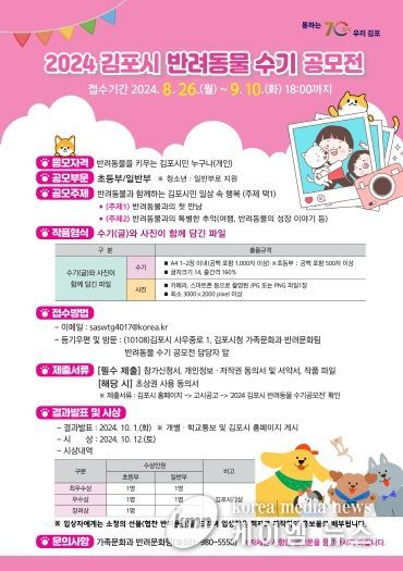 (케이엠뉴스) 김포시가 올바르고 성숙한 반려문화 조성‧정착을 위해 ‘반려동물 수기 공모전’을 오는 9월 10일까지 개최한다.
