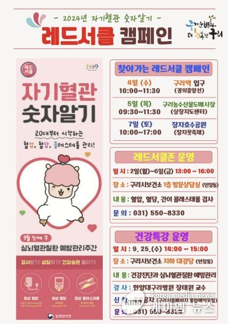 (케이엠뉴스) 구리시는 9월 첫째주 심뇌혈관질환 예방관리 주간을 맞아"자기혈관 숫자알기, 레드서클 캠페인"을 추진한다고 알렸다.