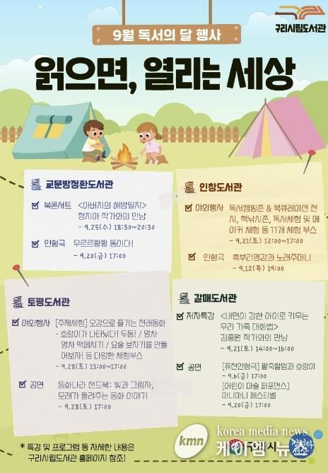 (케이엠뉴스) 구리시 시립도서관은 9월 독서의 달을 맞이하여 한 달간 북콘서트, 강연, 공연, 특강 프로그램, 야외행사 체험부스 운영 등 전 계층의 시민이 참여할 수 있는 다채로운 독서문화행사를 운영할 예정이다.