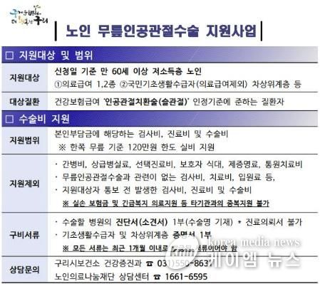 이번 사업은 저소득층 노인들의 의료비 부담 경감 및 건강 보장을 지원하기 위하여 마련됐다. 수술비용은 한쪽 무릎 기준 120만원 한도 내에서 지원하며, 신청 기한은 예산 소진 시까지다.