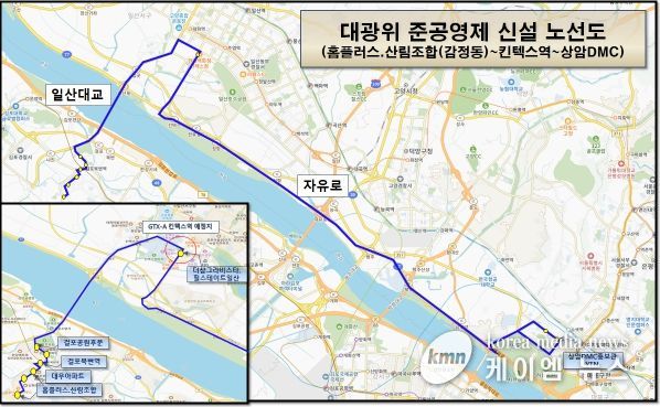 김포에서 상암 DMC까지 오가는 기존의 버스 노선은 1개 노선으로, 학운산단에서 김포한강신도시를 거치는 G6004번 노선 뿐이었다. 그러나 ‘사통팔달 김포’를 최우선 과제로 뛰고 있는 민선8기 김포시가 다방면으로 고심해 적극적으로 방안을 수립한 결과, 대광위 준공영제 사업 노선으로 최종 선정되게 됐다.