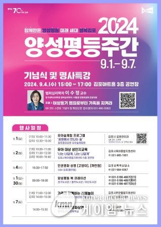 먼저 9월 4일은 김포아트홀에서 양성평등 유공표창과 기념식, 명사특강(범죄심리학자 이수정 교수), 여성사전시, 양성평등 체험부스 등이 진행된다.