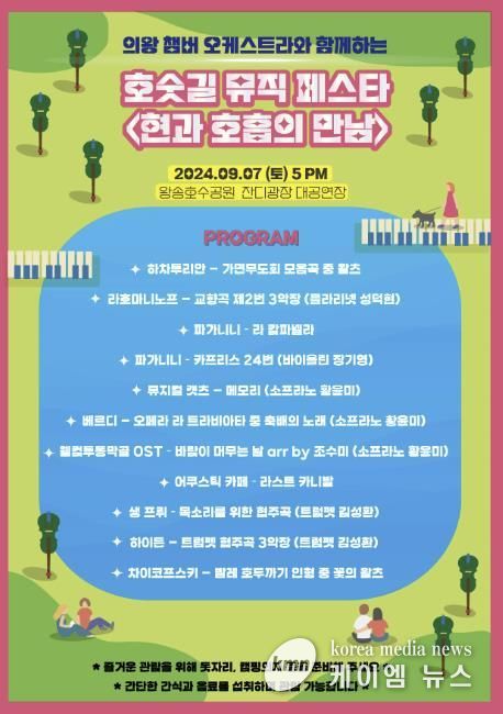 (케이엠뉴스) 의왕 챔버 오케스트라는 9월 7일 오후 5시 의왕 왕송호수공원 잔디광장에서 클래식 연주회 ‘호숫길 뮤직 페스타 2 – 현과 호흡의 만남’을 개최한다고 밝혔다.