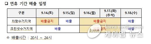 김포시 추석 연휴 생활폐기물 배출금지 기간은 16일과 추석 당일 17일 2일간이며, 연휴 기간 중 배출하지 못한 생활폐기물은 18일 20시 ~ 24시에 배출하면 된다.