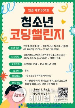 (케이엠뉴스) (재)김포시청소년재단 사우청소년문화의집은 단계별 SW교육을 통해 창의적인 사고력과 새로운 역량을 키울 수 있는 인증제11501호 ‘청소년코딩챌린지’ 프로그램을 9월 24일 ~ 9월 28일 화, 수, 목, 금, 토요일 총 5회기동안 운영한다.