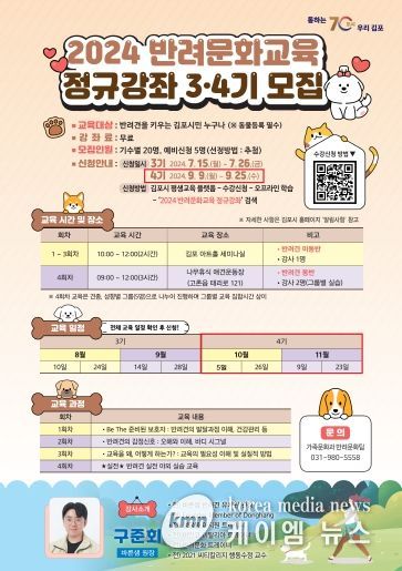 (케이엠뉴스) 김포시는 오는 9월 9일부터 25일까지 2024 반려문화교육 정규강좌 4기 참여자를 모집한다.