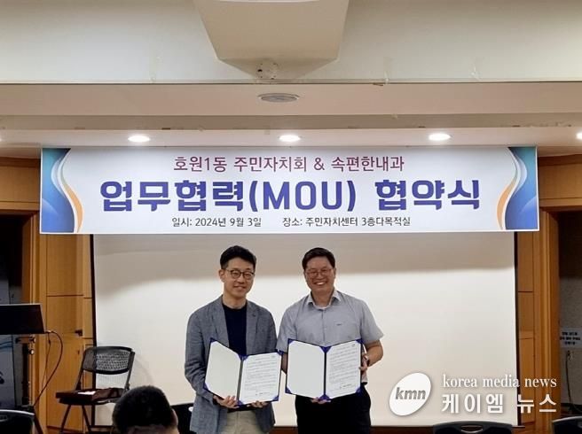 (케이엠뉴스) 의정부시 호원1동주민센터는 9월 3일 호원1동 주민자치회와 속편한내과가 원활한 업무 수행 및 서비스 제공을 위한 업무협약을 체결했다고 밝혔다.