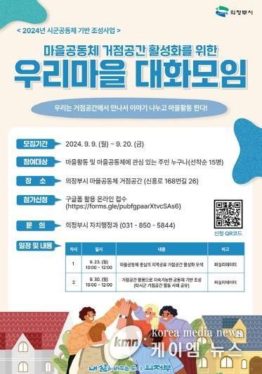 (케이엠뉴스) 의정부시는 9월 23일과 30일 양일간 의정부시 마을공동체 거점공간(신흥로168번길 26)에서 ‘우리마을 대화모임’을 개최한다.