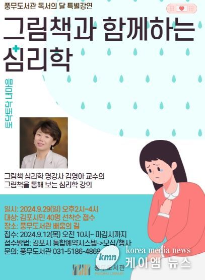 (케이엠뉴스) 김포시 풍무도서관은 독서의 달 특별강연 ‘그림책과 함께하는 심리학’를 오는 9월 29일 오후 2시에 풍무도서관 배움의 길에서 운영한다고 밝혔다.