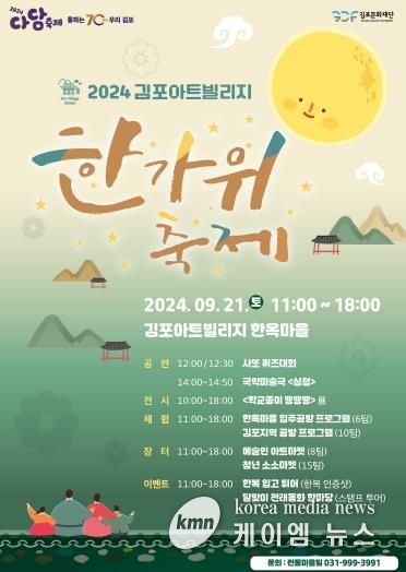 (케이엠뉴스) (재)김포문화재단은 오는 9월 21일 11시부터 18시까지 김포아트빌리지 한옥마을에서 '2024 김포아트빌리지 한가위 축제'를 개최, 다채로운 이벤트와 공연, 전시, 체험 프로그램을 선보일 계획이라고 밝혔다.