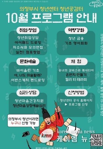 (케이엠뉴스) 의정부시 청년센터 청년공감터는 10월 프로그램 ‘청년 마음 성장 예술심리’에 참여할 청년(19~39세)을 9월 19일부터 모집한다.